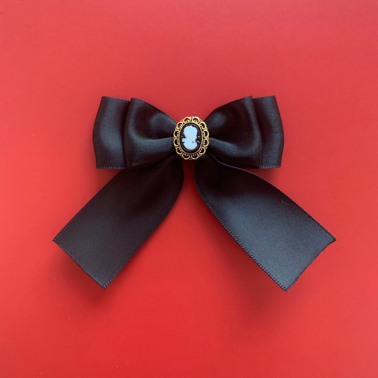 リボンの中央に使用した、凛とした女性を描いたボタンが印象的なサテンリボン。